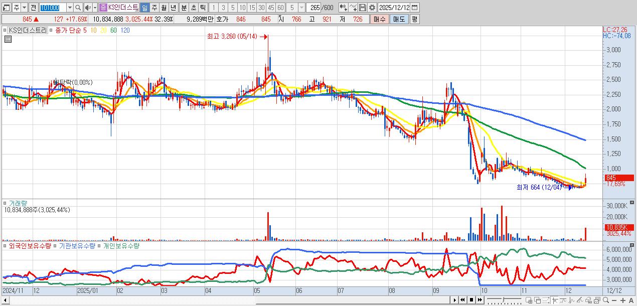 - KS인더스트리 (845원 ▲ 17.69% , 시총: 283억, 거래량: 10,834,888, 거래대금:93억)