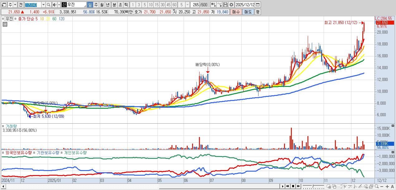 - 우진 (21,650원 ▲ 6.91% , 시총: 4,373억, 거래량: 3,338,951, 거래대금:704억, KOSPI)