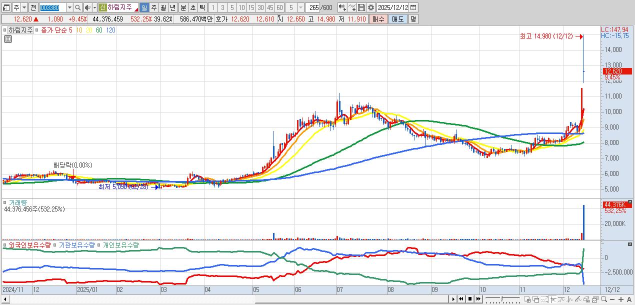- 하림지주 (12,550원 ▲ 8.85% , 시총: 14,057억, 거래량: 17,568,101, 거래대금:2,265억, KOSDAQ)