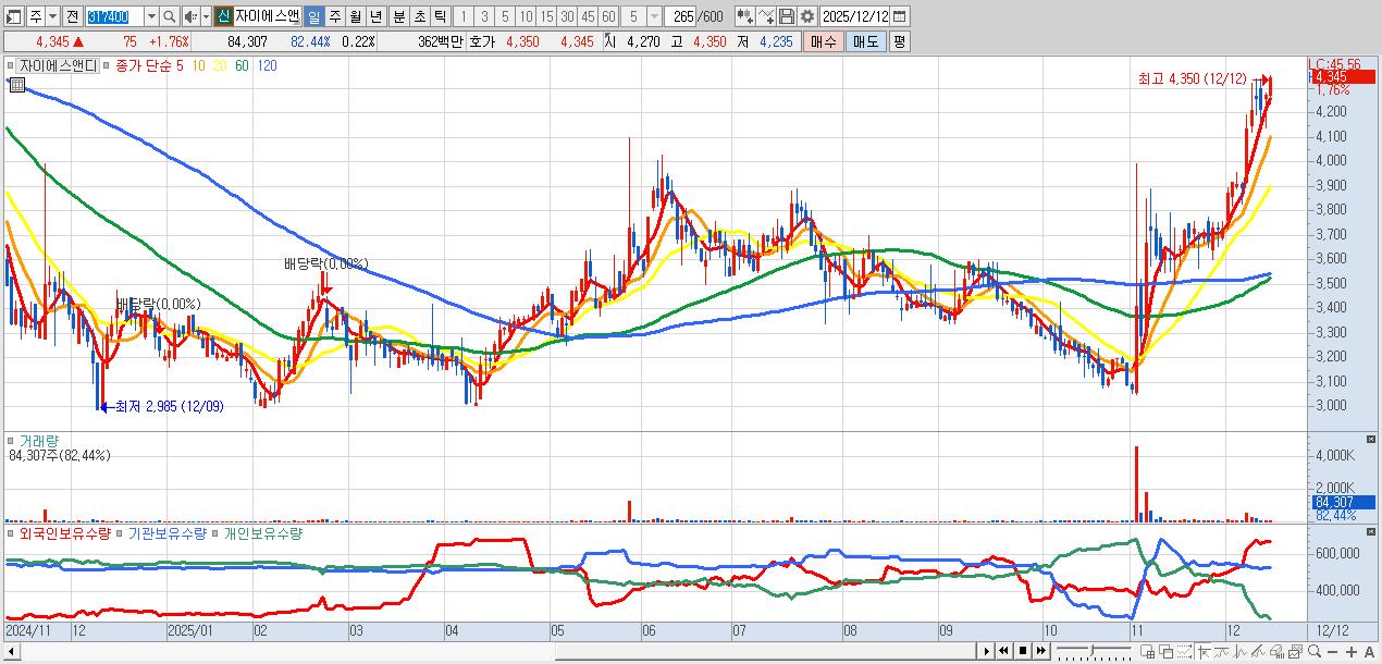 - 자이에스앤디 (4,345원 ▲ 1.76% , 시총: 1,685억, 거래량: 84,307, 거래대금:4억, KOSPI)
