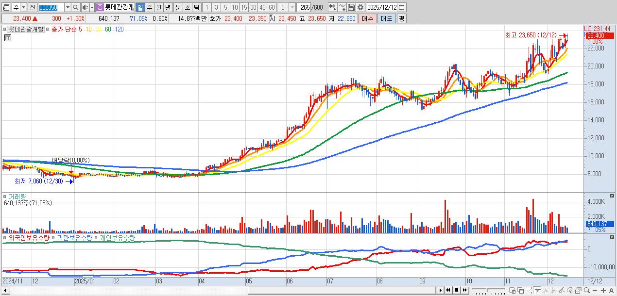 - 롯데관광개발 (23,400원 ▲ 1.3% , 시총: 18,612억, 거래량: 640,137, 거래대금:149억, KOSPI)