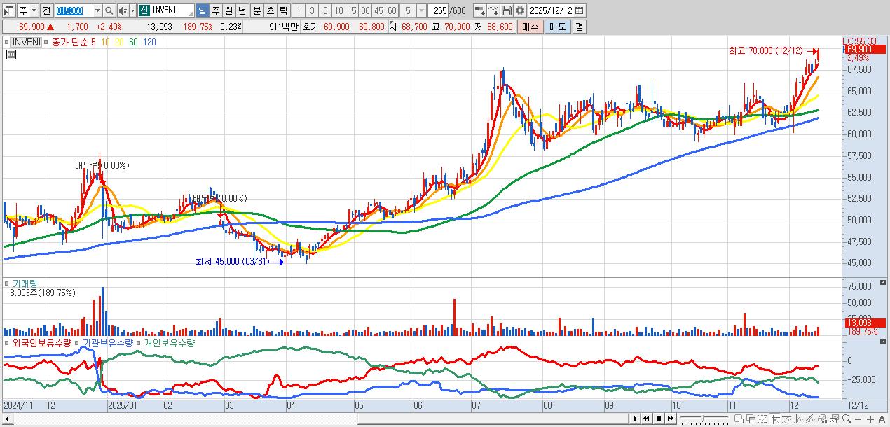 - INVENI (69,900원 ▲ 2.49% , 시총: 3,984억, 거래량: 13,093, 거래대금:9억, KOSPI)