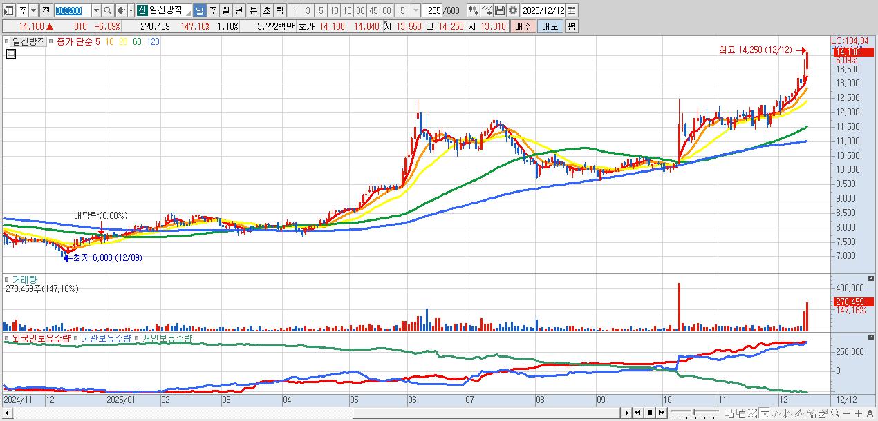 - 일신방직 (14,100원 ▲ 6.09% , 시총: 3,237억, 거래량: 270,459, 거래대금:38억, KOSPI)
