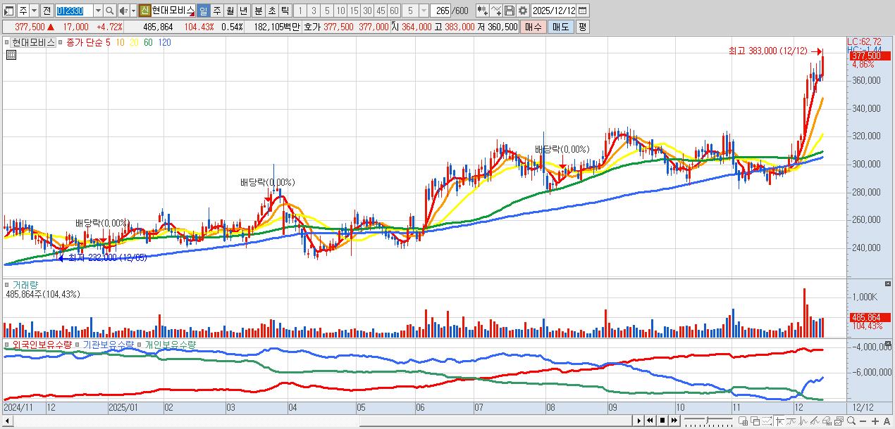 - 현대모비스 (377,500원 ▲ 4.72% , 시총: 342,516억, 거래량: 374,301, 거래대금:1,403억, KOSPI)