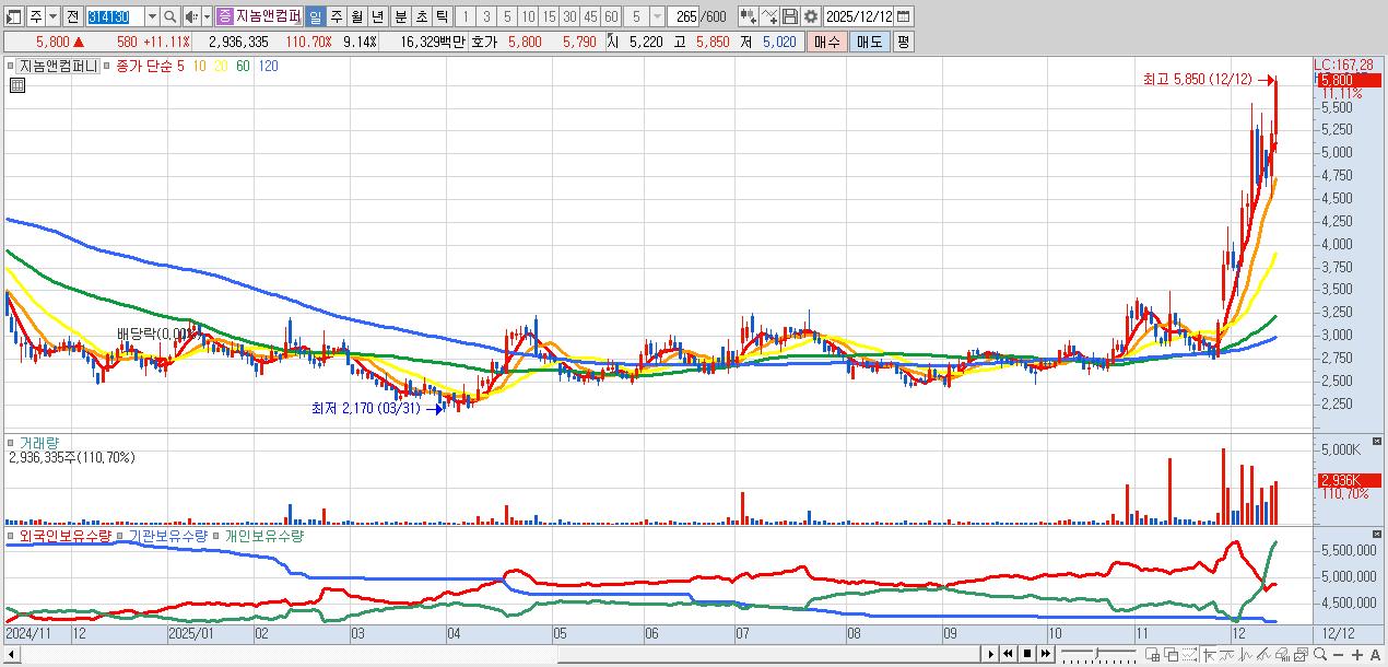 - 지놈앤컴퍼니 (5,800원 ▲ 11.11% , 시총: 1,862억, 거래량: 2,936,335, 거래대금:163억, KOSDAQ)