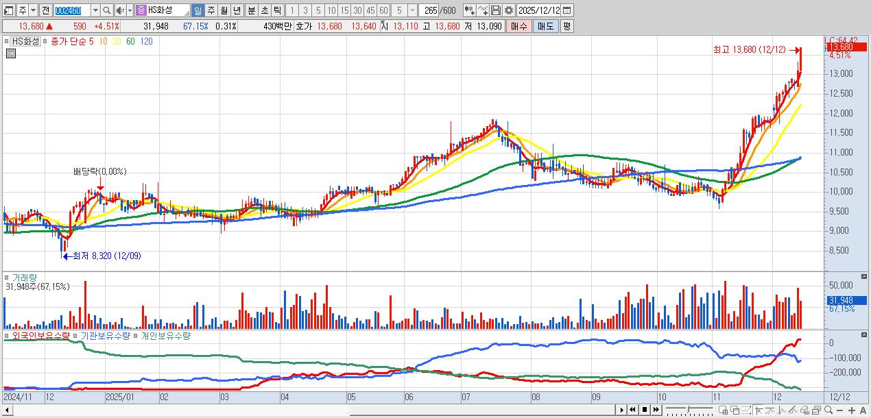 - HS화성 (13,680원 ▲ 4.51% , 시총: 1,389억, 거래량: 31,948, 거래대금:4억, KOSPI)