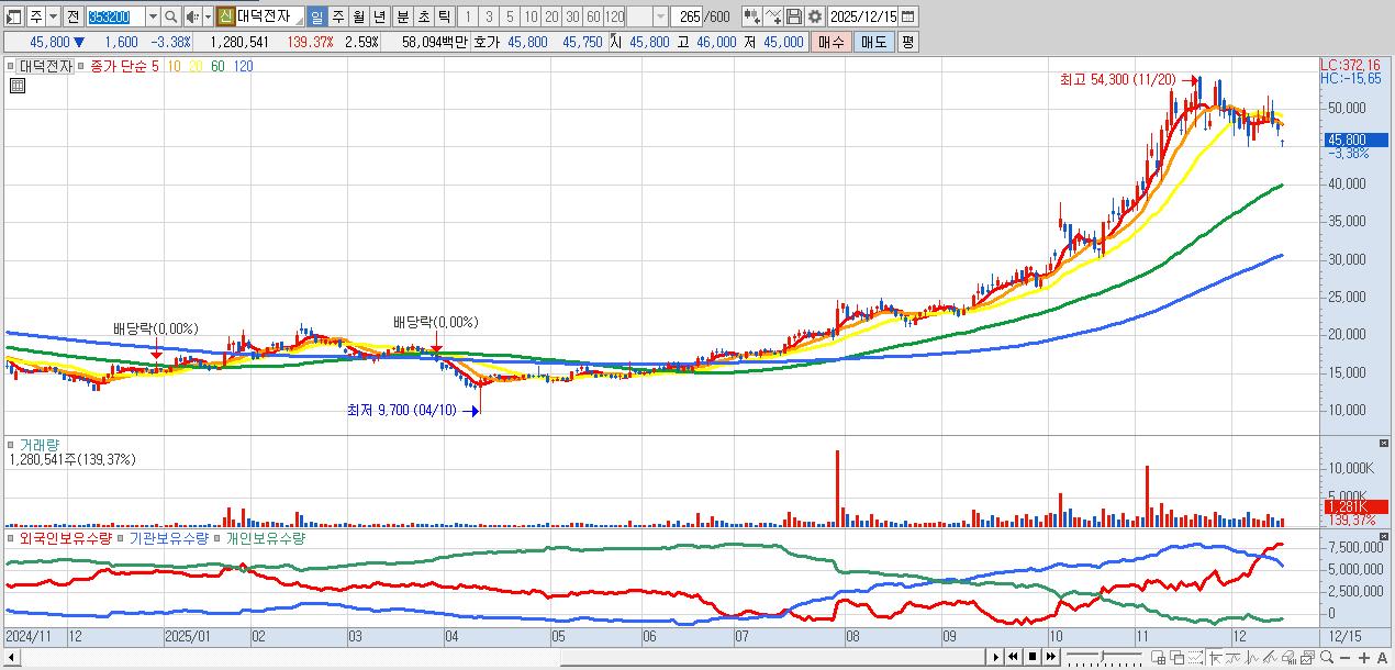- 대덕전자 (45,800원 ▼ -3.38% , 시총: 22,633억, 외국인 순매수 거래금:208억)