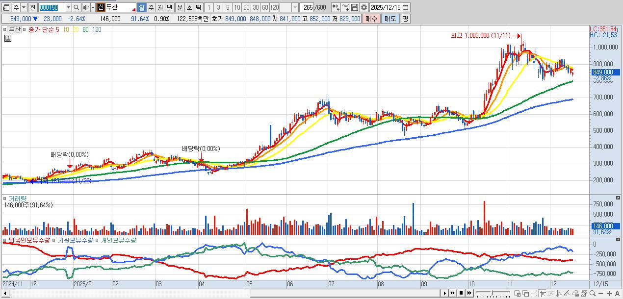 - 두산 (846,000원 ▼ -2.98% , 시총: 137,000억, 외국인 순매수 거래금:206억)