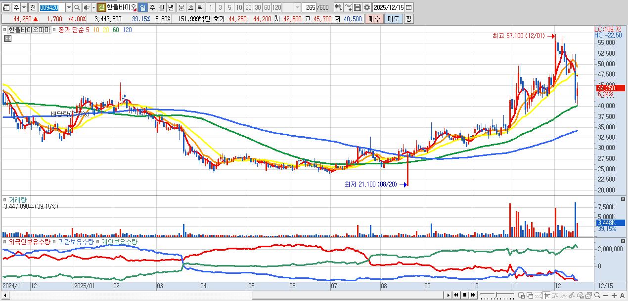 - 한올바이오파마 (44,300원 ▲ 4.11% , 시총: 23,143억, 외국인 순매수 거래금:162억)