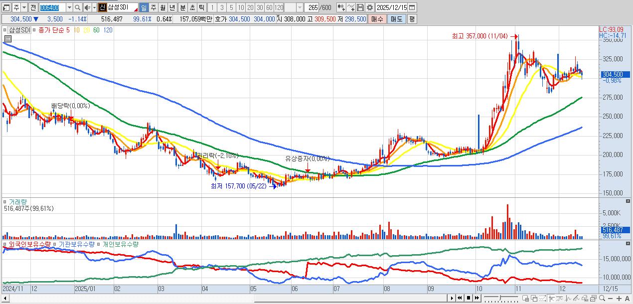 - 삼성SDI (303,000원 ▼ -1.62% , 시총: 244,174억, 외국인 순매수 거래금:94억)