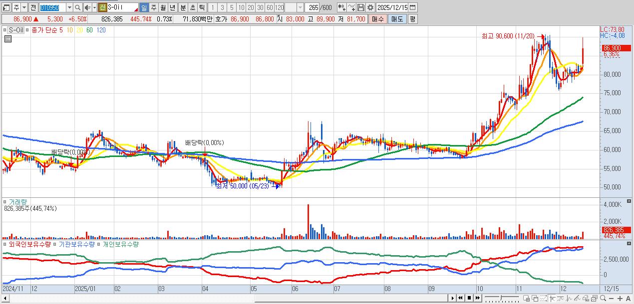 - S-Oil (86,400원 ▲ 5.88% , 시총: 97,272억, 외국인 순매수 거래금:101억)