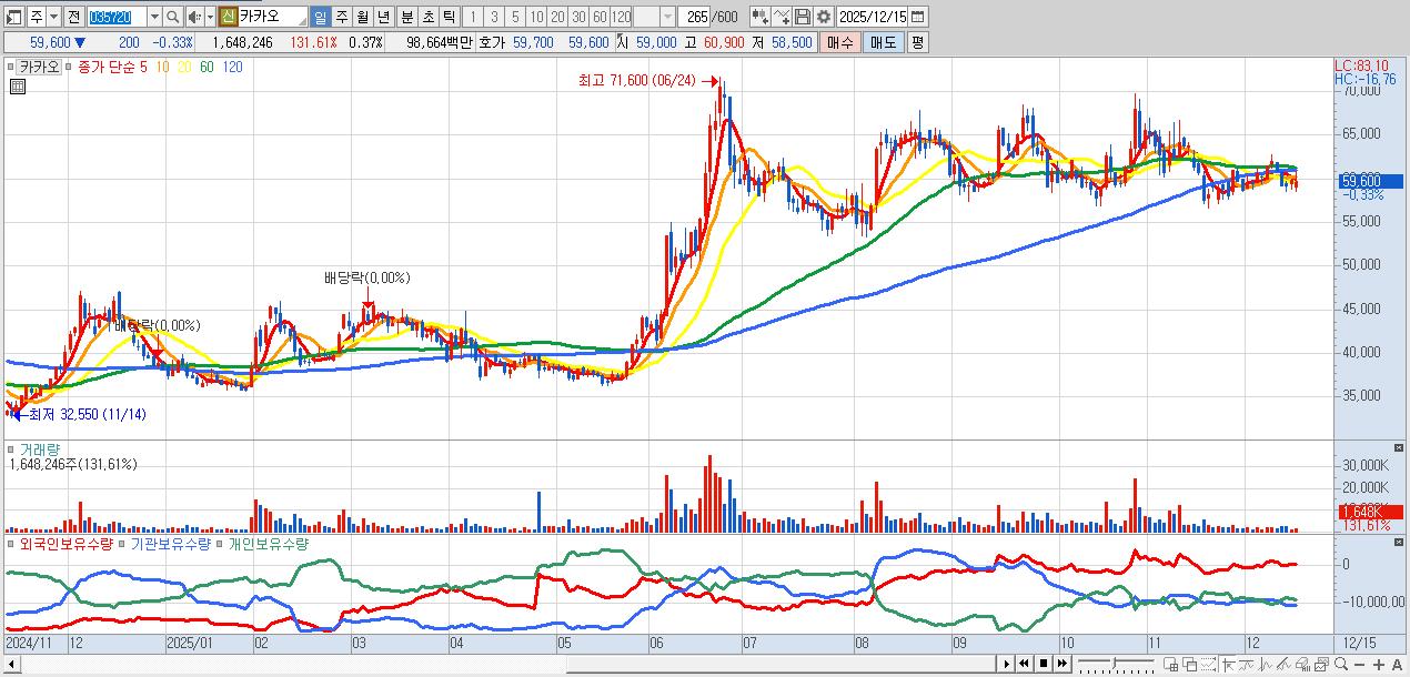 - 카카오 (59,600원 ▼ -0.33% , 시총: 263,685억, 외국인 순매수 거래금:220억)