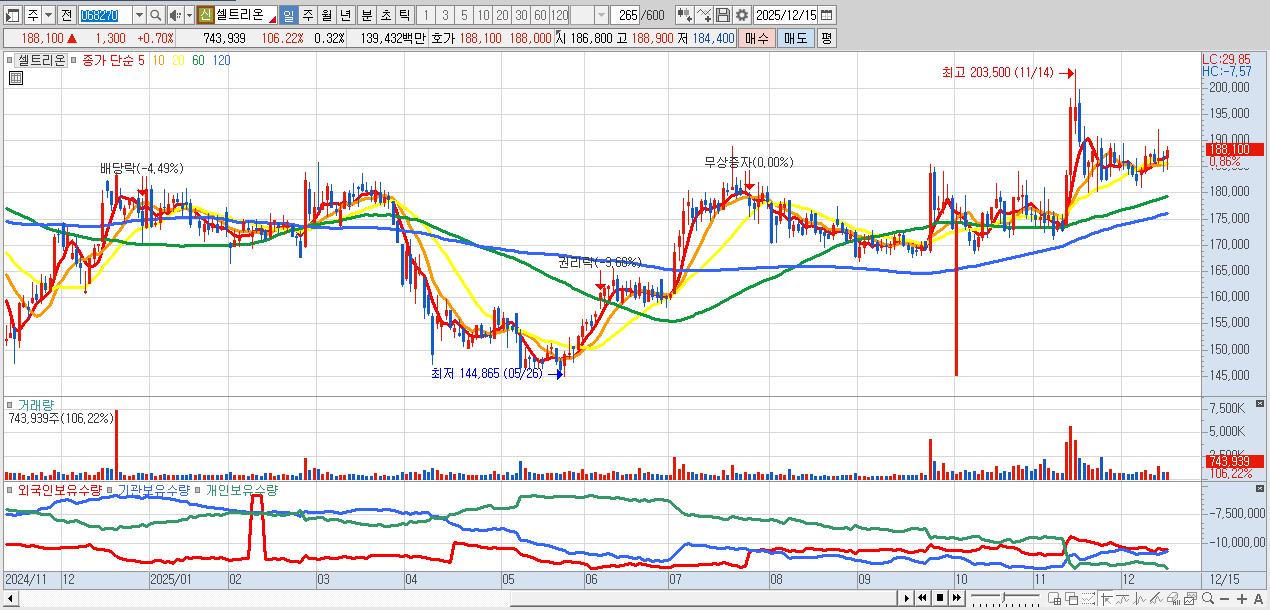 - 셀트리온 (187,800원 ▲ 0.54% , 시총: 433,745억, 외국인 순매수 거래금:190억)