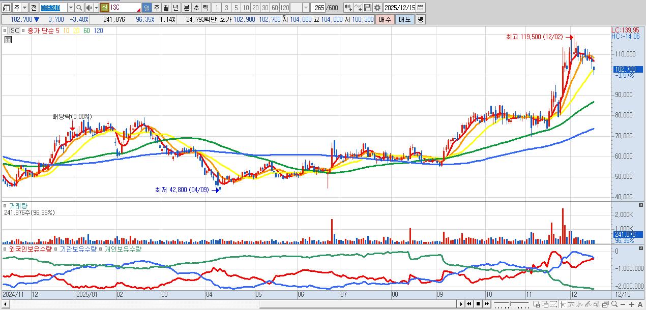 - ISC (103,000원 ▼ -3.2% , 시총: 21,833억, 외국인 순매수 거래금:95억)
