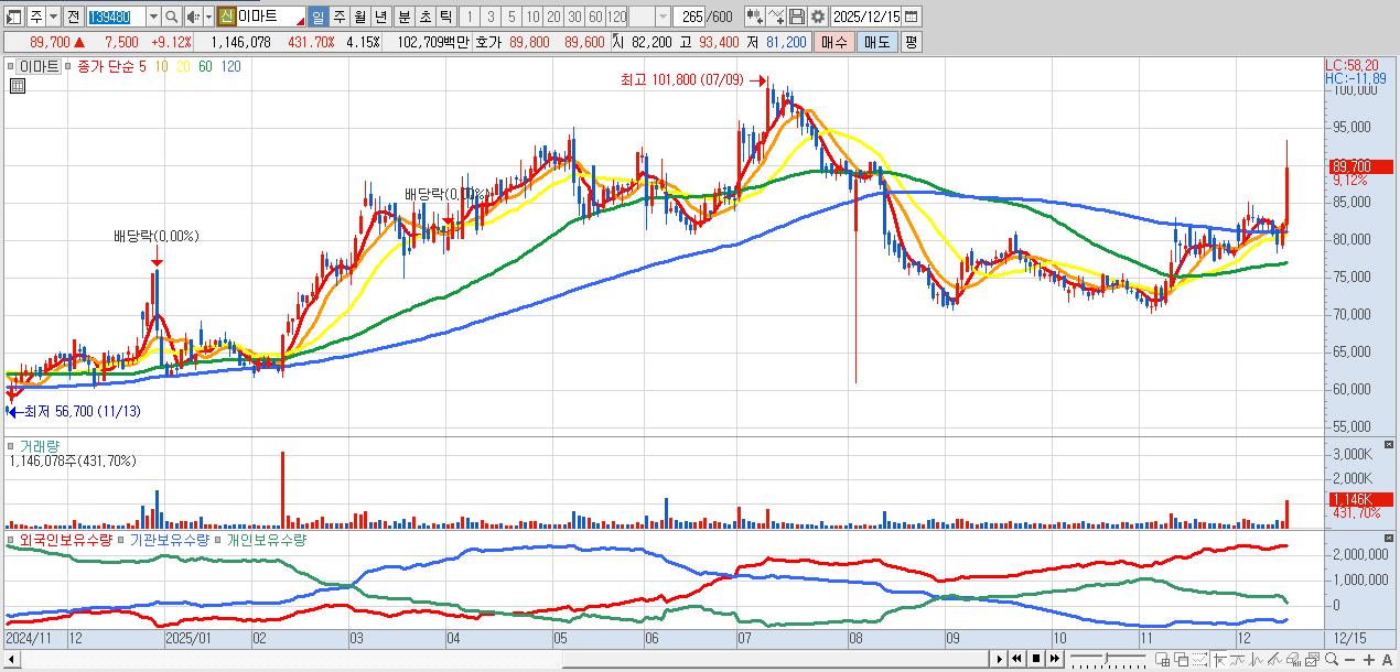 - 이마트 (89,400원 ▲ 8.76% , 시총: 24,671억, 외국인 순매수 거래금:132억)