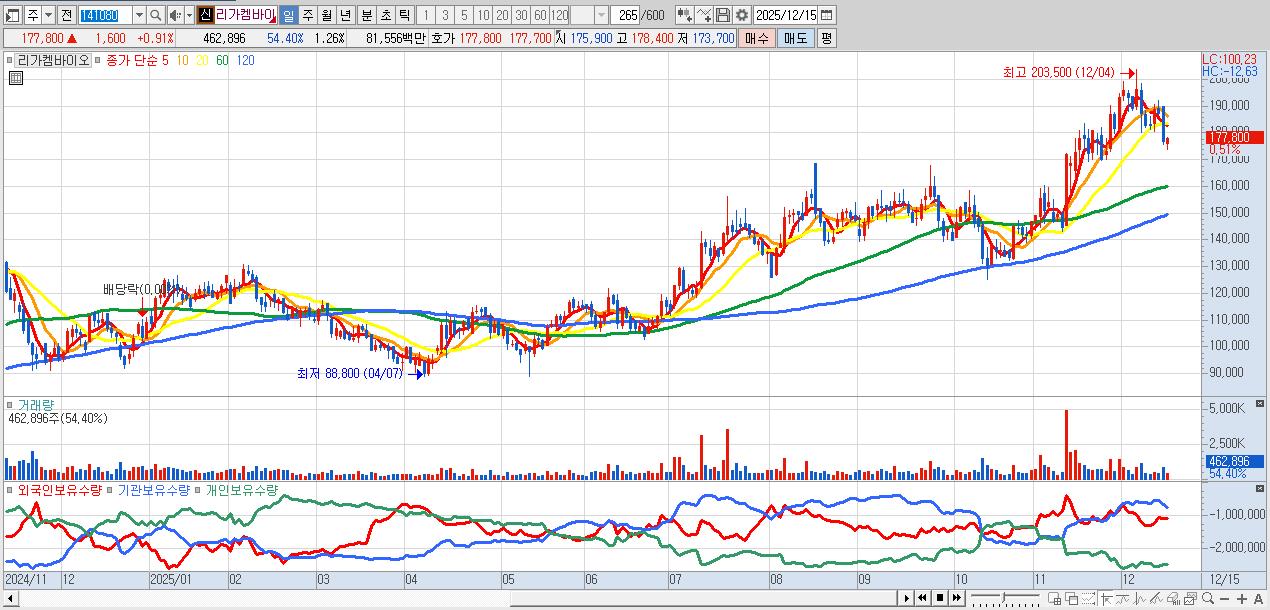 - 리가켐바이오 (177,900원 ▲ 0.96% , 시총: 65,130억, 외국인 순매수 거래금:160억)