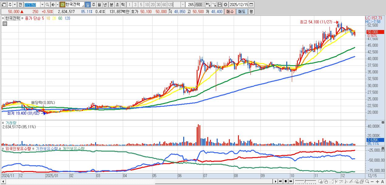 - 한국전력 (50,000원 ▲ 0.5% , 시총: 320,982억, 외국인 순매수 거래금:237억)