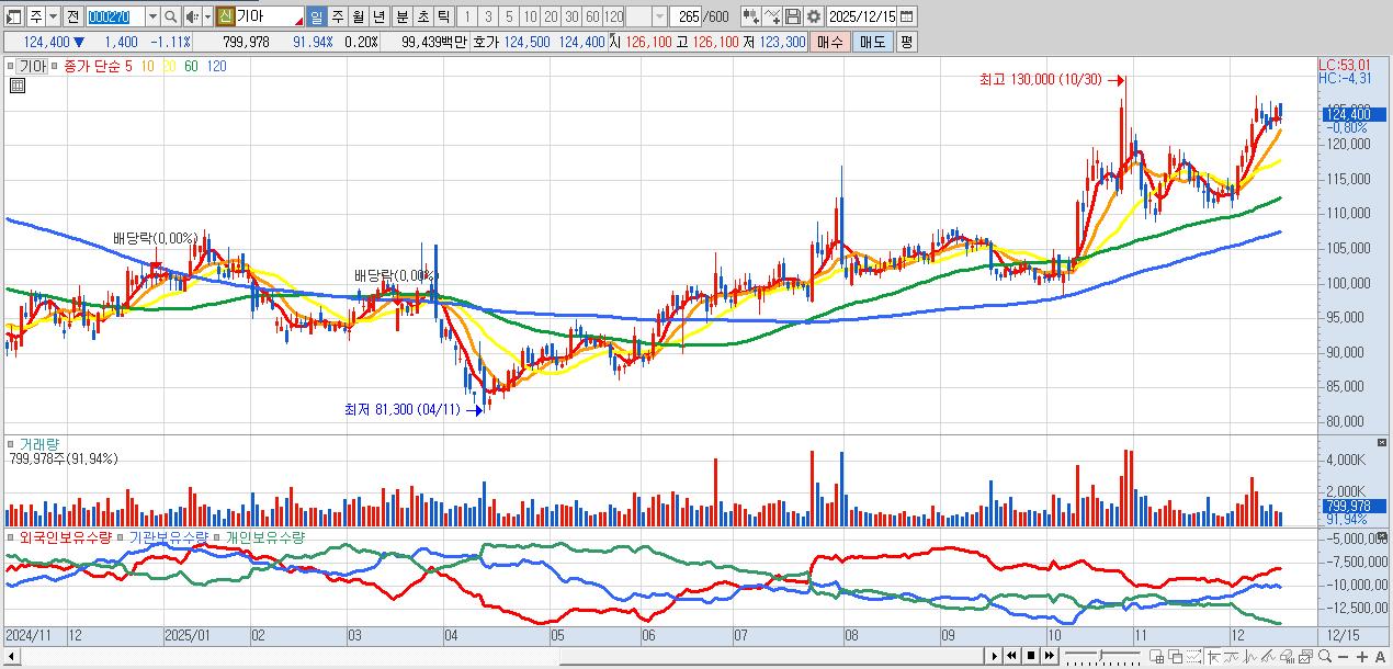 - 기아 (124,000원 ▼ -1.43% , 시총: 484,112억, 외국인 순매수 거래금:213억)