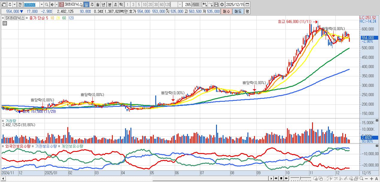 - SK하이닉스 (554,000원 ▼ -2.98% , 시총: 4,033,133억, 외국인 순매수 거래금:683억)