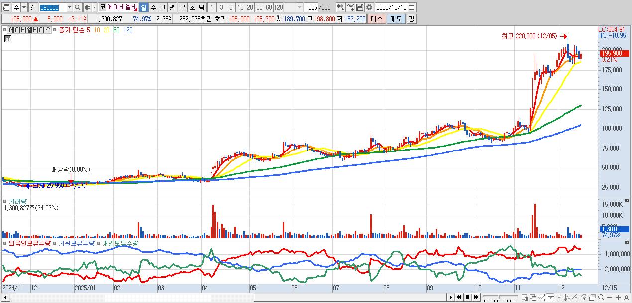 - 에이비엘바이오 (195,800원 ▲ 3.05% , 시총: 107,935억, 외국인 순매수 거래금:266억)