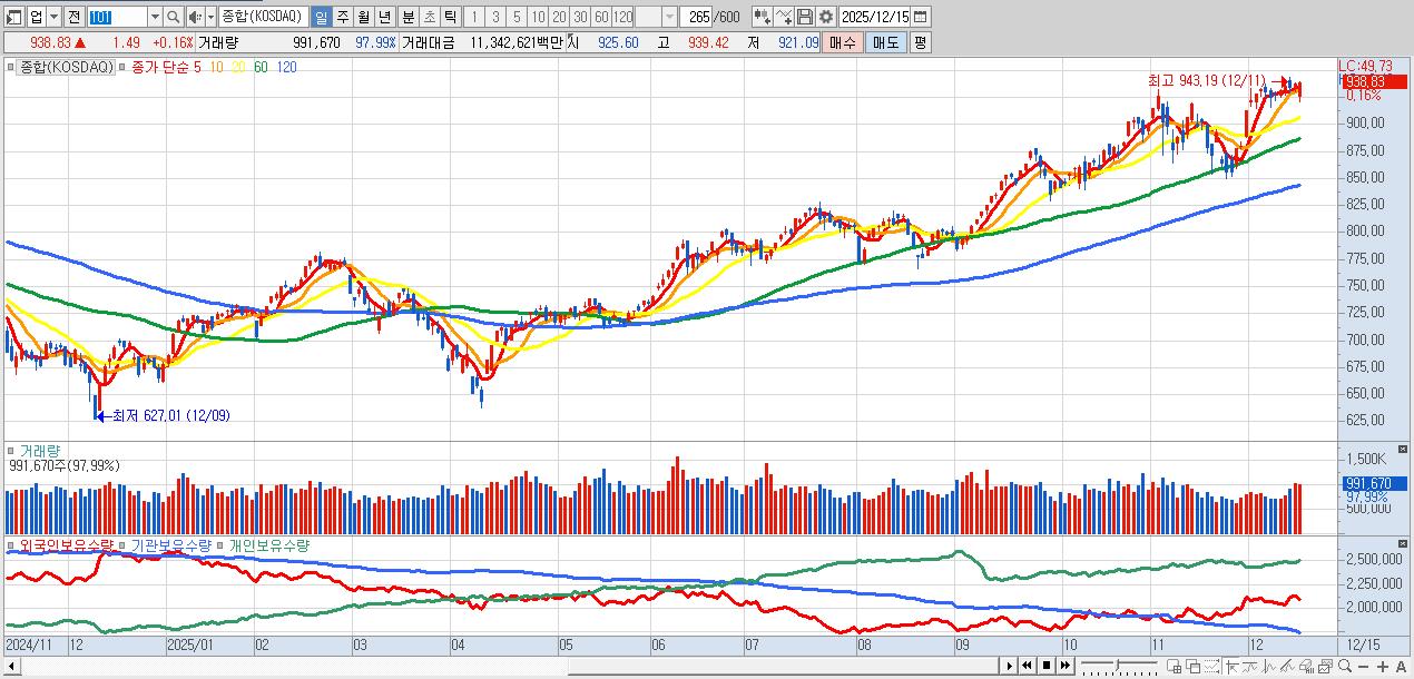 | 12/15 | 938.83 | ▲0.16% | 1,813억 | -185억 | -1,323억 | -306억 |
