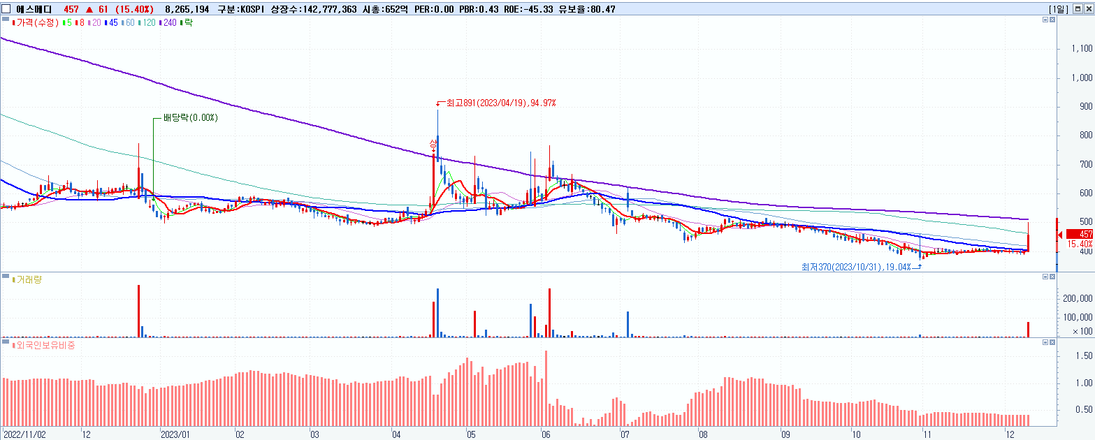 - 에스메디 (457원 ▲ 15.4% , 시총: 652억, 거래량: 8,311,052, 거래대금:39억)