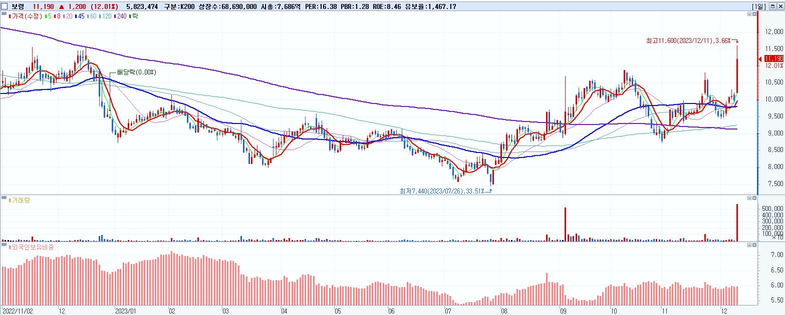 - 보령 (11,190원 ▲ 12.01% , 시총: 7,686억, 거래량: 5,953,026, 거래대금:663억)