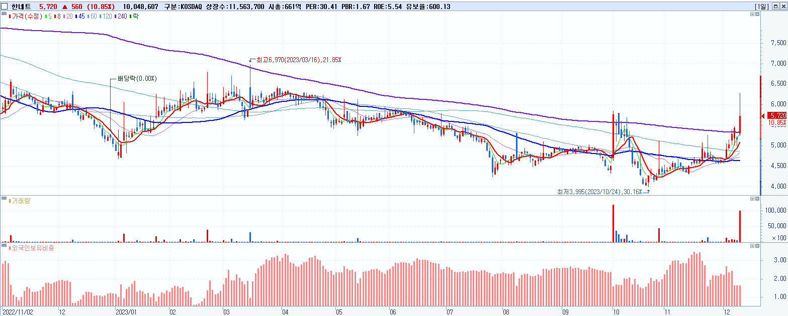 - 한네트 (5,720원 ▲ 10.85% , 시총: 661억, 거래량: 10,059,771, 거래대금:591억)