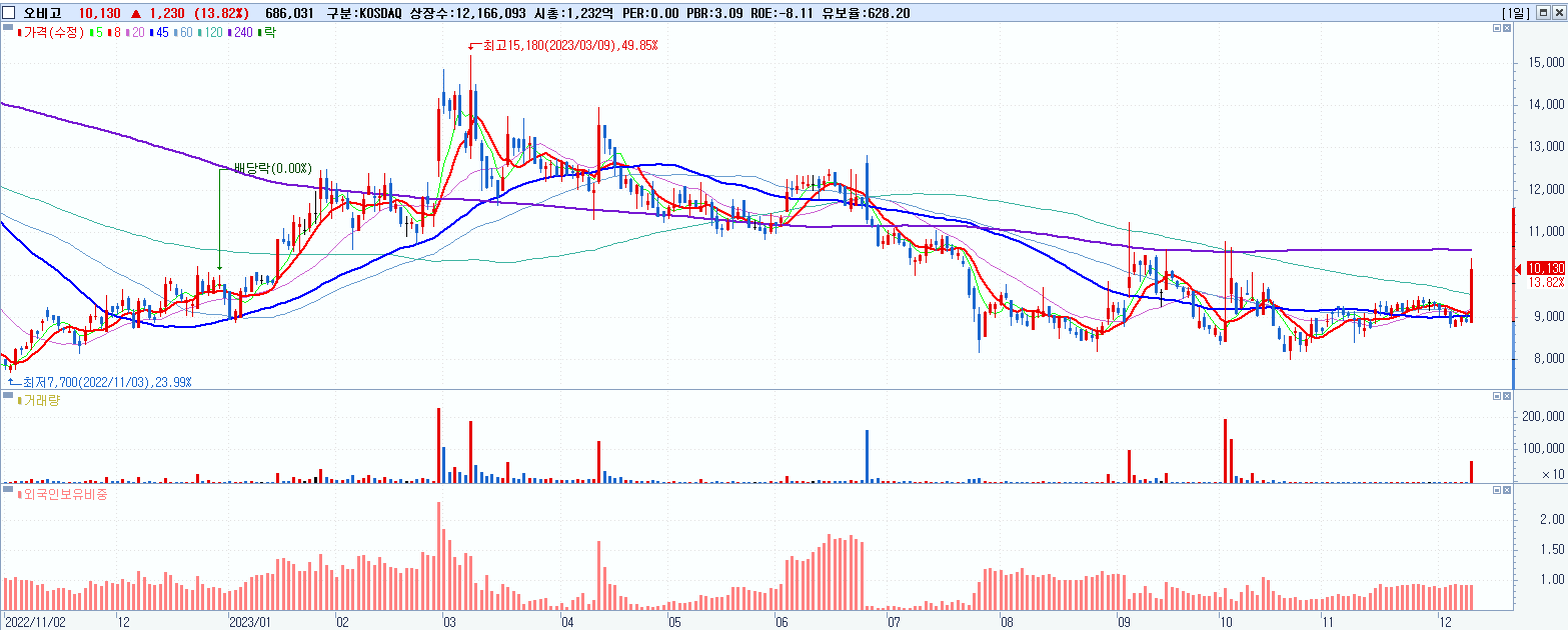 - 오비고 (10,130원 ▲ 13.82% , 시총: 1,232억, 거래량: 688,336, 거래대금:67억)