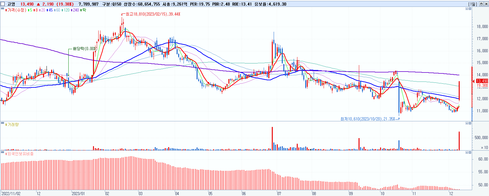 - 고영 (13,490원 ▲ 19.38% , 시총: 9,262억, 거래량: 8,139,801, 거래대금:1,046억)