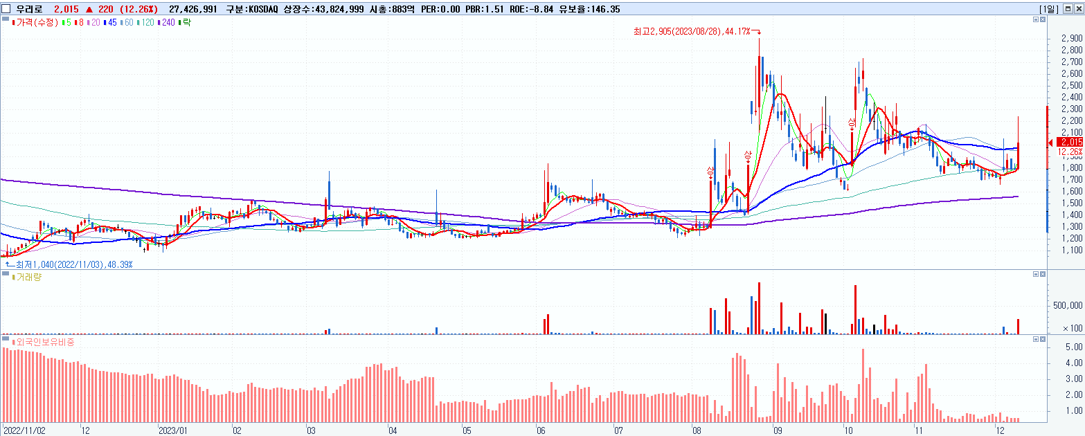 - 우리로 (2,015원 ▲ 12.26% , 시총: 883억, 거래량: 27,577,116, 거래대금:565억)
