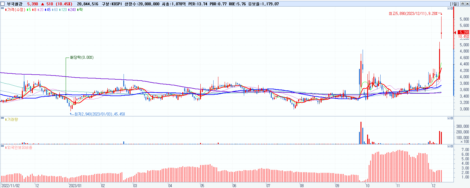 - 부국철강 (5,390원 ▲ 10.45% , 시총: 1,078억, 거래량: 20,887,760, 거래대금:1,168억)