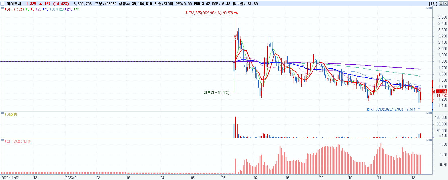 - 아이톡시 (1,325원 ▲ 14.42% , 시총: 519억, 거래량: 3,311,686, 거래대금:43억)