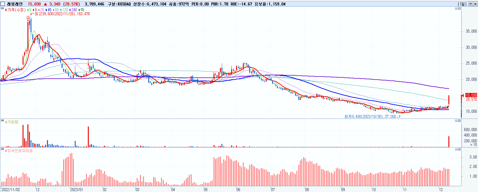 - 래몽래인 (15,030원 ▲ 28.57% , 시총: 973억, 거래량: 3,836,876, 거래대금:534억)