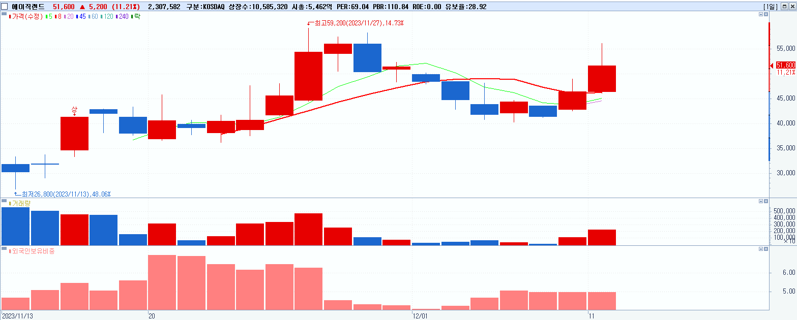 - 에이직랜드 (51,600원 ▲ 11.21% , 시총: 5,462억, 거래량: 2,320,866, 거래대금:1,223억)