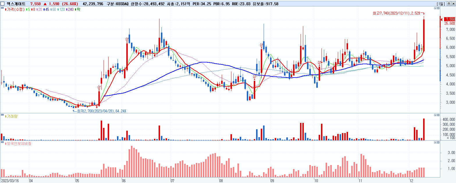 - 엑스게이트 (7,550원 ▲ 26.68% , 시총: 2,151억, 거래량: 42,557,033, 거래대금:2,989억)