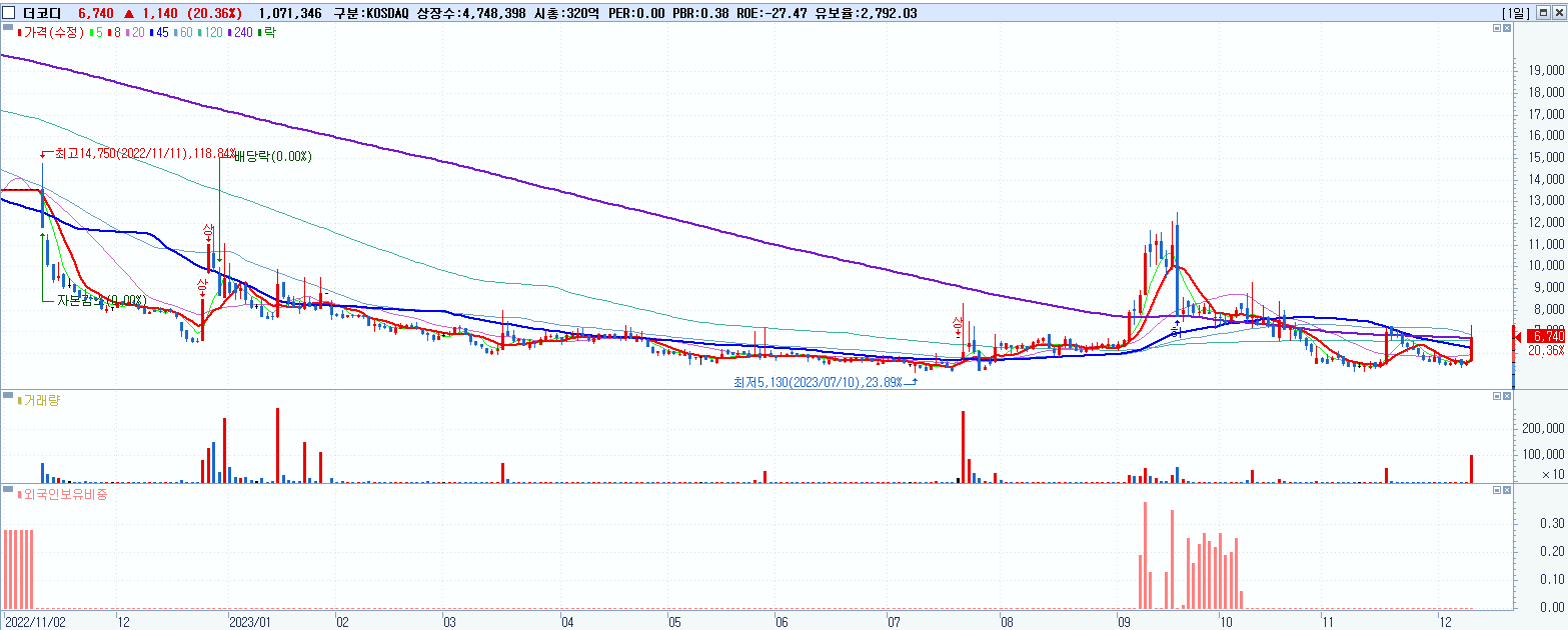 - 더코디 (6,740원 ▲ 20.36% , 시총: 320억, 거래량: 1,073,365, 거래대금:74억)
