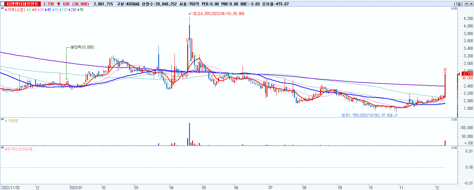 2.티엔엔터테인먼트 2,730원 ▲ 30% (KOSDAQ, 131100)