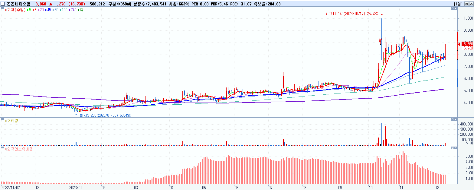- 전진바이오팜 (8,860원 ▲ 16.73% , 시총: 663억, 거래량: 591,656, 거래대금:51억)