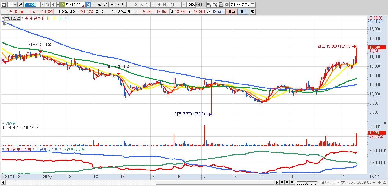 - 한세실업 (15,030원 ▲ 10.35% , 시총: 6,012억, 거래량: 976,562, 거래대금:145억, KOSPI)