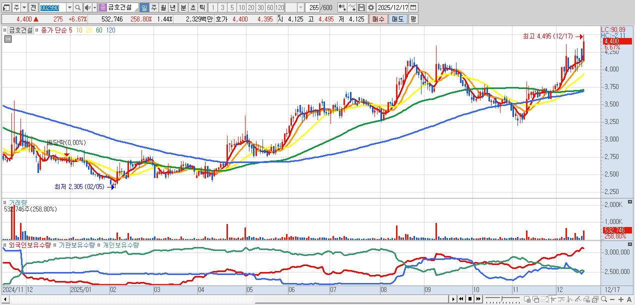 - 금호건설 (4,400원 ▲ 6.67% , 시총: 1,628억, 거래량: 532,746, 거래대금:23억, KOSPI)