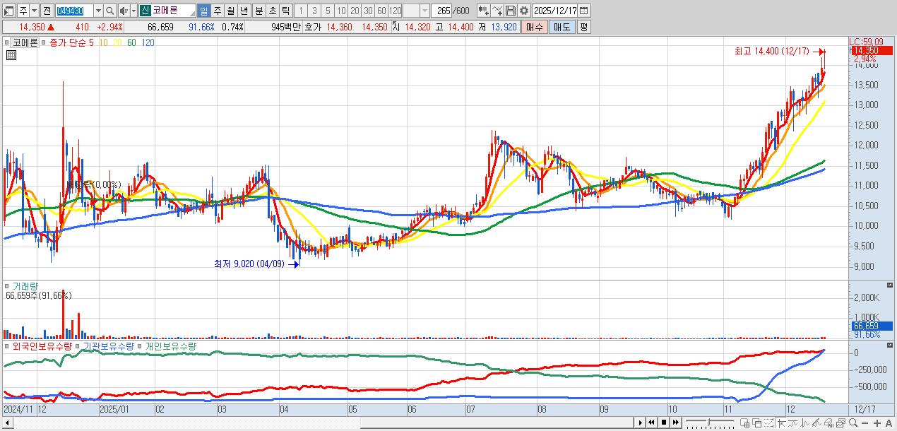 - 코메론 (14,350원 ▲ 2.94% , 시총: 1,298억, 거래량: 66,659, 거래대금:9억, KOSDAQ)