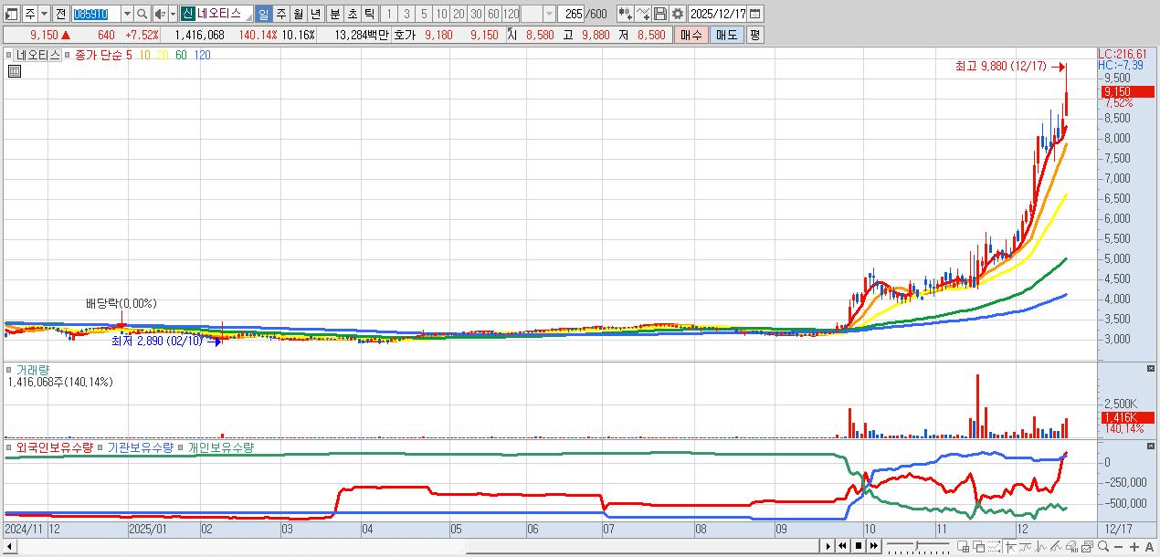 - 네오티스 (9,150원 ▲ 7.52% , 시총: 1,275억, 거래량: 1,416,068, 거래대금:133억, KOSDAQ)
