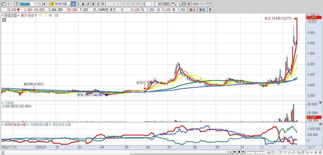 - 대성산업 (10,430원 ▲ 29.89% , 시총: 4,718억, 거래량: 3,264,303, 거래대금:311억, KOSPI)