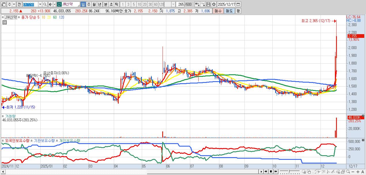 - JW신약 (2,155원 ▲ 13.9% , 시총: 1,150억, 거래량: 46,033,055, 거래대금:962억, KOSDAQ)