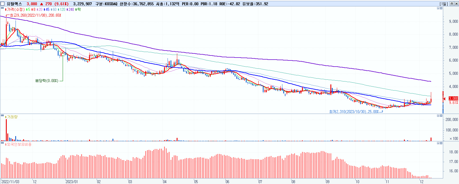 - 유틸렉스 (3,080원 ▲ 9.61% , 시총: 1,132억, 거래량: 3,231,371, 거래대금:104억)