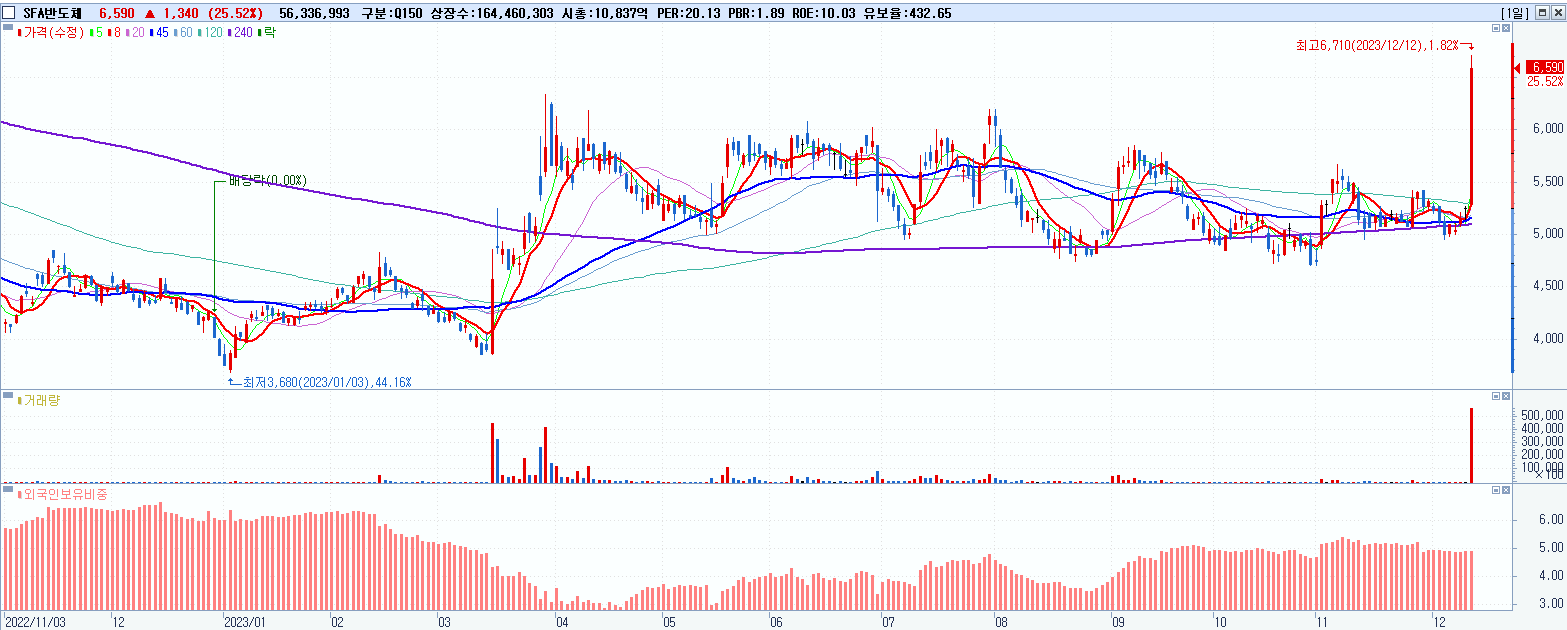 - SFA반도체 (6,590원 ▲ 25.52% , 시총: 10,838억, 거래량: 56,643,349, 거래대금:3,560억)