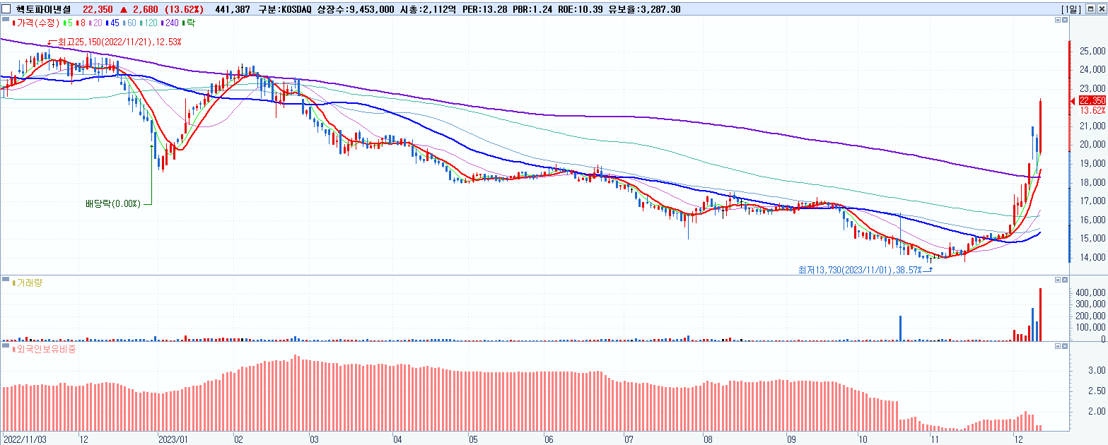 - 헥토파이낸셜 (22,350원 ▲ 13.62% , 시총: 2,113억, 거래량: 441,632, 거래대금:96억)