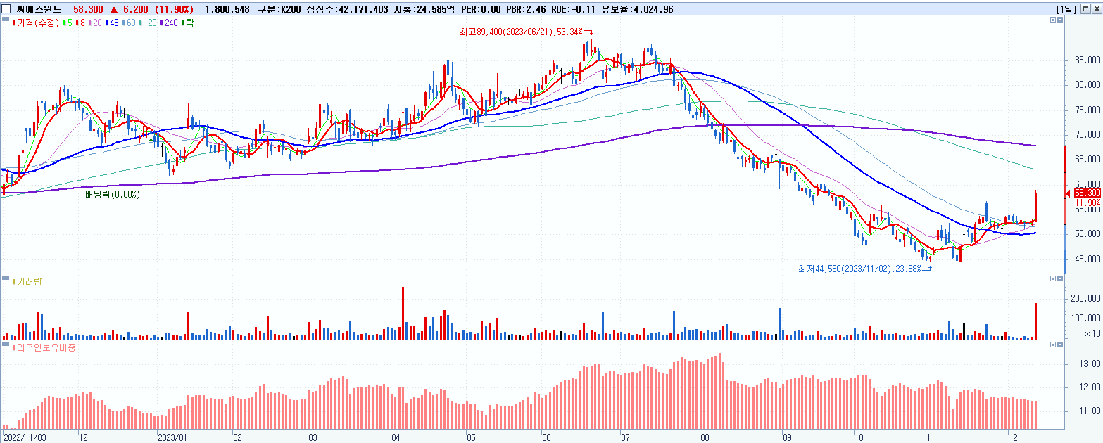- 씨에스윈드 (58,300원 ▲ 11.9% , 시총: 24,586억, 거래량: 1,803,023, 거래대금:1,036억)