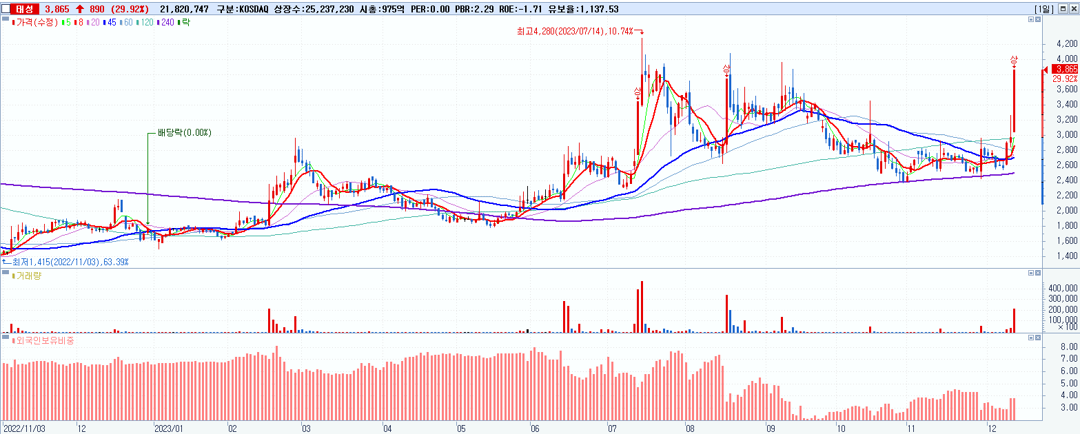 - 태성 (3,865원 ▲ 29.92% , 시총: 975억, 거래량: 21,822,341, 거래대금:775억)